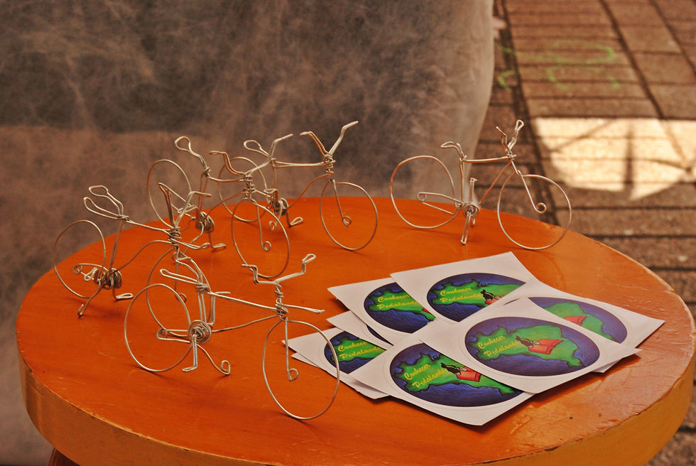 Estávamos com nossa barraca ao lado do bicicletário, uma estrutura improvisada com cavaletes para melhor recepcionar e atender os ciclistas, como também estimular o uso da bicicleta como meio de transporte para visitar a feirinha. Além do bicicletário, nossa barraca expôs materiais educativos que demonstravam os benefícios e contribuições que a bicicleta tem a oferecer, as leis e os direitos dos ciclistas no trânsito, roteiros de cicloturismo, livros que abordavam a questão de mobilidade urbana, o sistema de transportes, e relatos de cicloviajantes. Através de fotografias e de um portfólio também divulgamos as ações, objetivos e os lugares que o Projeto Conhecer Pedalando percorreu. Além das fotografias tínhamos também adesivos e marca paginas artísticos e com algumas das paisagens e lugares que conhecemos pedalando.