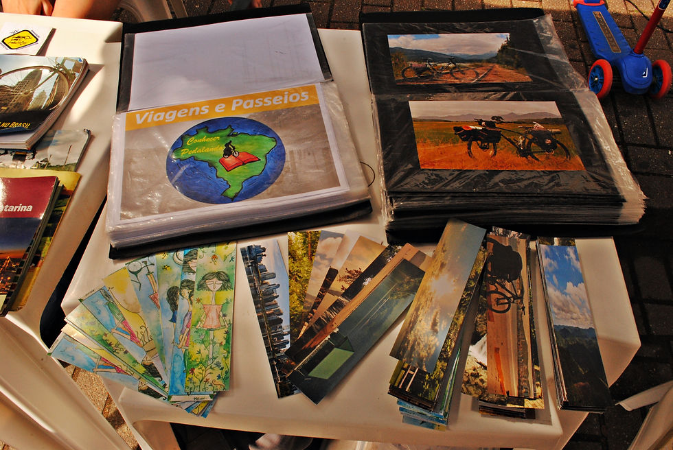 Na Feirinha, buscamos incentivar o uso da bicicleta como meio de transporte, conversar e discutir sobre a bicicleta e também divulgar alguns dos vários benefícios que a mesma pode proporcionar à mobilidade urbana, às cidades e à saúde humana e planetária. Nossa barraca expôs materiais educativos que demonstravam os benefícios e contribuições que a bicicleta tem a oferecer, as leis e os direitos dos ciclistas no trânsito, roteiros de cicloturismo, livros que abordavam a questão de mobilidade urbana, o sistema de transportes, e relatos de cicloviajantes. Através de fotografias e de um portfólio também divulgamos as ações, objetivos e os lugares que o Projeto Conhecer Pedalando percorreu. Além das fotografias tínhamos também adesivos e marca paginas artísticos e com algumas das paisagens e lugares que conhecemos pedalando.